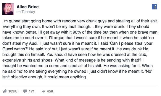 : Comedian Alice Brine's viral FB posts perfectly explains how dumb victim blaming is